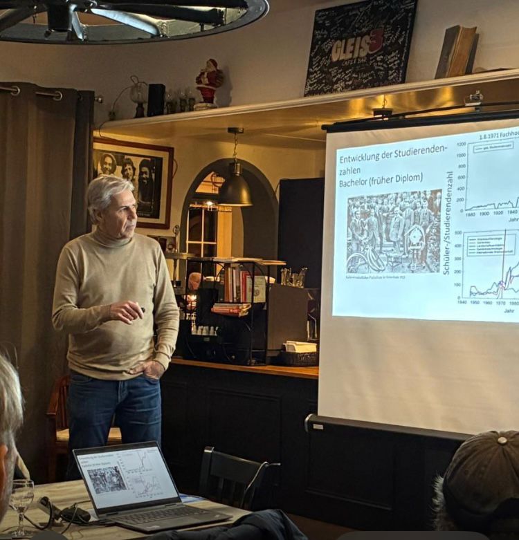 Tiefe Einblicke in die Hochschule Geisenheim – ein Spezialfall der Hochschullandschaft gab Prof. Dr. Schulz beim Stammtisch am 30.01.26 für alle Mitglieder und Freunde des Partnerschaftsverein Geisenheim e.V.. Der Präsident der Hochschule sprach über die Historie, den Standort, die Konzepte, die Entwicklung und die Herausforderungen der Hochschule und über die Transformation in die Zukunft. Sehr informativ und kurzweilig berichtete er über die verschiedenen Studiengänge und die Entwicklung der Studierenden innerhalb der letzten Jahrzehnte. Besonders spannend war der Weg seit 2010 durch die Folgen der Fachhochschulgesetze Forschung/Lehre zur Bildung der Hochschule neuen Typs – der einzigen vom Wissenschaftsrat evaluierten Hochschule Deutschlands. Hier spürten die Zuhörer, dass Prof. Dr. Schulz diesen Prozess aktiv miterlebt und gestaltet hat. Mit großer Begeisterung schilderte er die Vielfalt des Studienangebotes, erläuterte die Forschungsprojekte, stellte die besonderen Wissenschaftler vor und zeigte die Herausforderungen der einzigartigen Gebäude und Institute auf. Beeindruckend sind die internationalen Kontakte und Bildungspartenschaften zur weltweiten Kooperation. Für unsere Region wird die Hochschule aktiv die Vorbereitungen zur Bundesgartenschau 2029 begleiten. Sehr kritisch werden die sinkenden Studierendenzahlen gesehen, denen durch weitreichende Innovationsideen und größtmögliche Flexibilität in der Zukunft gegengesteuert werden muss. Prof. Dr. Schulz stellte sich den Fragen der Interessierten insbesondere zur Entwicklung der Weinwirtschaft. Er vermittelte ein teilweise neues und absolut spannendes Bild der Hochschule Geisenheim University.